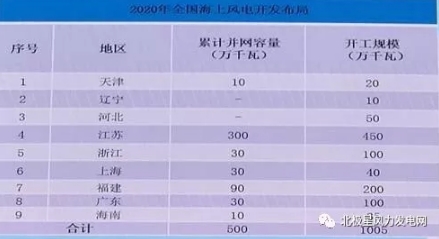 可再生能源發展十三五規劃顯示,積極穩妥推進海上風電開發,到2020年,開工建設1000萬千瓦,確保建成500萬千瓦。