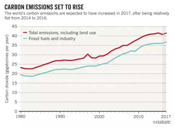 2014-2016年全球二氧化碳排放量保持平穩(wěn)的原因有多個(gè),包括中國(guó)經(jīng)濟(jì)增速放緩;美國(guó)“煤改氣”;全球可再生能源(如太陽(yáng)能和風(fēng)能)使用量增加。許多氣候科學(xué)家和政策制定者原本希望溫室氣體排放量停止增長(zhǎng)代表了能源使用的轉(zhuǎn)變——溫室氣體排放量達(dá)到峰值后將迎來(lái)下降。