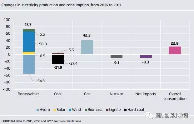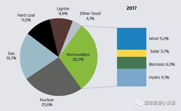 如果在可再生能源中不計水電,2017年歐盟風電、生物質和太陽能發電量(679TWh)在歷史上首次超過了煤電(669TWh)。