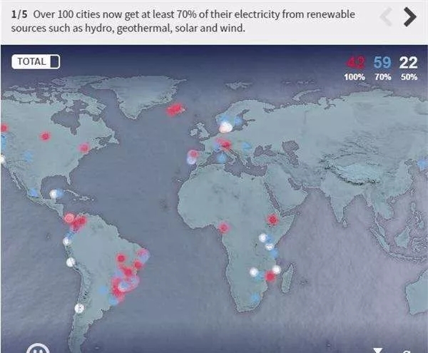 據(jù)非盈利性機(jī)構(gòu)CDP數(shù)據(jù)顯示,目前全球范圍內(nèi)已經(jīng)有100多個(gè)城市通過(guò)利用可再生能源來(lái)實(shí)現(xiàn)70%的電力能源供應(yīng)。