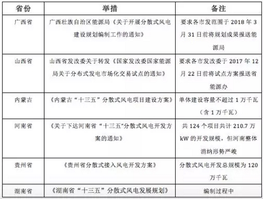 在“三北”地區棄風限電形勢嚴峻以及市場上優質集中式項目逐步開發殆盡的情況下,風電從集中大規模連片開發轉向集中式和分散式協同發展勢在必行, 2017年5月國家能源局發布了《關于加快推進分散式接入風電項目建設有關要求的通知》,要求各省級能源主管部門制定分散式風電發展方案,明確分散式風電項目不受年度指導規模限制。隨后各省加快了制定分散式風電發展方案的步伐,目前已明確編制分散式風電建設規劃的省份有:廣西、山西、內蒙古、河南、貴州和湖南。