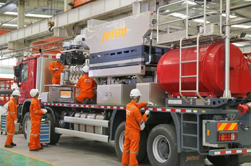 國內第一套巖屑回注成套設備、國內第一臺大管徑的連續油管作業設備、國內首套液氮泵送設備、世界最大功率的壓裂車、世界最大管徑連續油管半掛車……杰瑞不斷推出的新裝備不僅填補了國內空白,同時還將產品銷往北美、南美、中東、歐洲、俄羅斯等全球60余個國家和地區,與國際傳統大品牌企業同臺競爭。