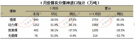 動力煤方面,3月份動力煤進口量為1252萬噸,環比增31.9%。3月份中國進口動力煤最多的國家是澳大利亞,進口量為506萬噸,環比增21.03%,同比增57.93%;排在第二位的是印度尼西亞,3月份出口中國動力煤477萬噸,環比增28.59%,同比增86.96%。