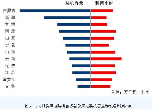 分類型看,1-4月份,全國水電設備平均利用小時為845小時,比上年同期降低26小時。在水電裝機容量超過1000萬千瓦的8個省份中,湖南、云南、廣東和四川同比分別降低371、64、60和12小時,貴州、廣西、青海和湖北同比分別增加213、141、139和34小時;全國火電設備平均利用小時為1426小時(其中,燃煤發電設備平均利用小時1467小時),比上年同期增加69小時。分省份看,全國共有12個省份火電設備利用小時超過全國平均水平,其中陜西、江西、河北和青海超過1600小時,內蒙古、安徽、寧夏、甘肅和江蘇超過1500小時,云南和西藏分別僅為708和94小時。與上年同期相比,全國共有24個省份火電利用小時數同比增加,其中,福建同比增加超過400小時,增加416小時,云南、湖南、廣東和重慶同比增加超過200小時,分別增加290、258、223和220小時,而江蘇、北京、山東、新疆、貴州、河北和寧夏同比降低,其中江蘇、北京和山東同比分別降低128、125和125小時;全國核電設備平均利用小時2287小時,比上年同期增加62小時;全國并網風電設備平均利用小時812小時,比上年同期增加150小時;全國太陽能發電設備平均利用小時410小時。