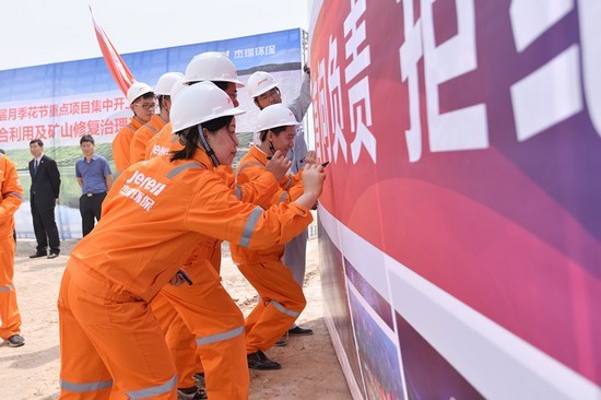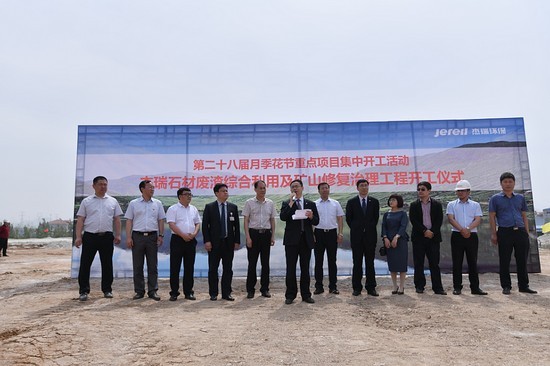 柞村鎮(zhèn)黨委書記楊棟、柞村鎮(zhèn)鎮(zhèn)長邱維興、全國綠色礦山聯(lián)盟理事長杜根杰、杰瑞環(huán)保集團(tuán)董事長王丕學(xué)、杰瑞集團(tuán)高級副總裁李雪峰、杰瑞設(shè)計院院長楊波出席項目開工儀式并為項目奠基。