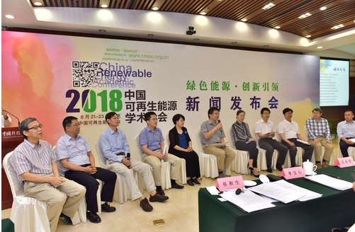 6月10日“2018中國可再生能源學術大會新聞發布會”在中國科技會堂召開,大會主席、中國可再生能源學會理事長譚天偉,程序委員會主席、中國可再生能源學會副理事長李寶山,學術委員會主席、中國可再生能源學會副理事長許洪華,評獎委員會主席、中國可再生能源學會副理事長吳創之,大會秘書長、中國可再生能源學會秘書長祁和生等出席發布會并致辭。