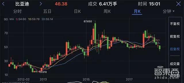 4、2017年9月至今,比亞迪股價處于一個波浪下降的態勢,其從2017年9月逐步上漲到10月9日的72元左右后又逐漸下跌到了46元左右,總市值1200多億元。