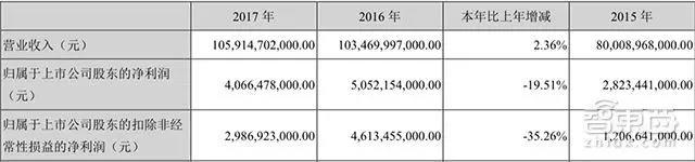 財報數據顯示,比亞迪從2015年—2017年的營收分別為800億、1034億和1059億元,歸屬股東的凈利潤分別為28.2億、50.5億和40.6億,扣除非經常性損益后凈利潤分別為12.06億、46.13億和29.86億元。