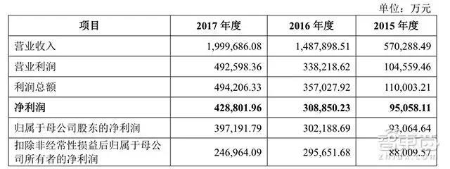 寧德時代招股書顯示,從2015年—2017年的營收分別為,57億、148.7億和199.9億,歸屬股東凈利潤分別為9.3億、30.2億和39.7億,扣非凈利潤為8.8億、29.5億和24.6億。