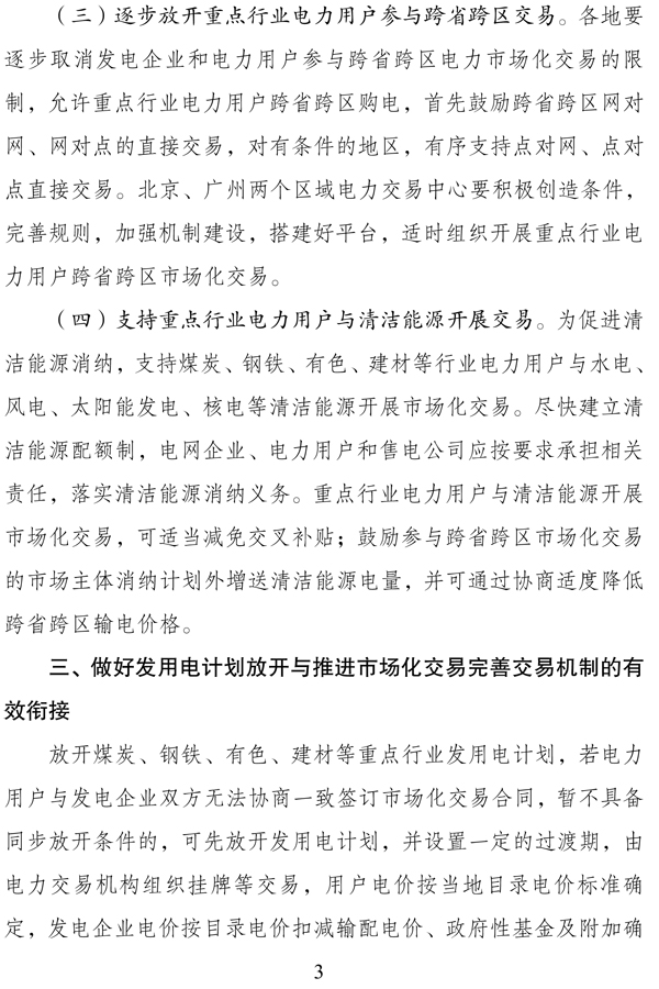 (三)在確保供電安全的前提下,完善和創新交易規則,推進規劃內的風電、太陽能發電等可再生能源在保障利用小時數之外參與直接交易、替代火電發電權交易及跨省跨區現貨交易試點等,通過積極參與市場化交易,增加上網電量,促進消納。各地要結合實際合理確定可再生能源保障利用小時數,做好優先發電保障和市場化消納的銜接。