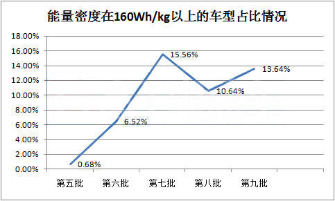 而在近幾批推薦目錄中,眾車企繼續發力高額補貼,能量密度160Wh/kg以上的車型逐漸增多,由第五批推薦目錄的0.68%,提升至了15.56%。在第7批到第9批目錄中,能量密度在160Wh/kg以上的車型占比均維持在10%以上,這些車型均可以拿到1.2倍補貼。