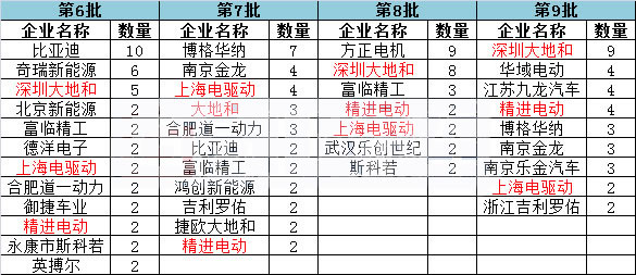 從第5-9批推薦目錄來看,為每批目錄的新能源乘用車配套的電機企業眾多,車企自配電機占比越來越多。除了車企自配外,精進電動、上海電驅動、深圳大地和等企業新能源乘用車領域較具優勢。
