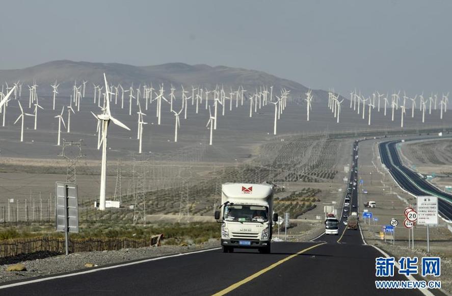 汽車行駛在新疆吐魯番市郊區風力發電場一旁的公路上(9月22日攝)。新華社記者趙戈 攝