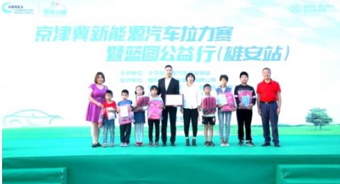 【眾嘉賓和劉莊小學(xué)師生一起為京津冀新能源汽車?yán)愻咚{圖公益行雄安站點贊】