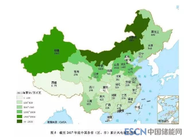 2017年,中國六大區域的風電新增裝機容量所占比例分別為華北(25%)、中南(23%)、華東(23%)、西北(17%)、西南(9%)、東北(3%)。“三北”地區新增裝機容量占比為45%,中東南部地區新增裝機容量占比達到55%。