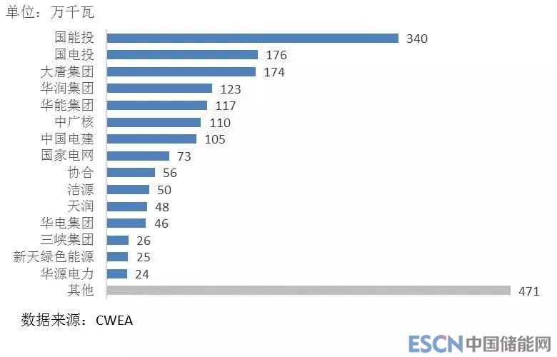 2017年,中國風電有新增裝機的開發企業共80多家,前十五家裝機容量合計接近1500萬千瓦,占比達到76%。截至2017年底,前十家開發企業累計裝機容量合計超過1.3億千瓦,占比達到71%。