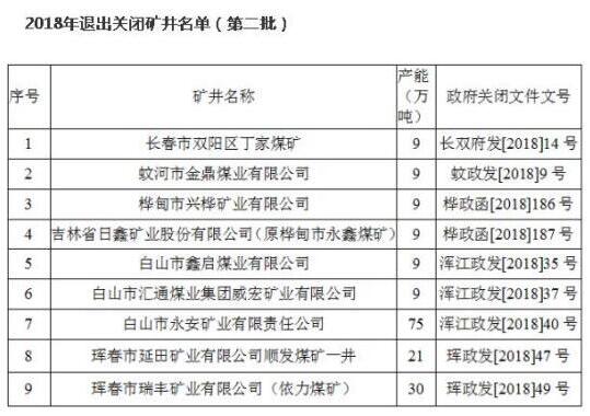 近日,按照《中共中央國務院關于全面振興東北地區等老工業基地的若干意見》(中發〔2016〕7號)和《國務院關于煤炭行業化解過剩產能實現脫困發展的意見》(國發〔2016〕7號)及國家發展改革委等部委關于煤炭行業去產能一系列文件精神,長春市雙陽區人民政府、吉林市蛟河市人民政府、吉林市樺甸市人民政府、白山市渾江區人民政府、延邊州琿春市人民政府按照相關要求,決定對長春市雙陽區丁家煤礦等9處礦井予以關閉。