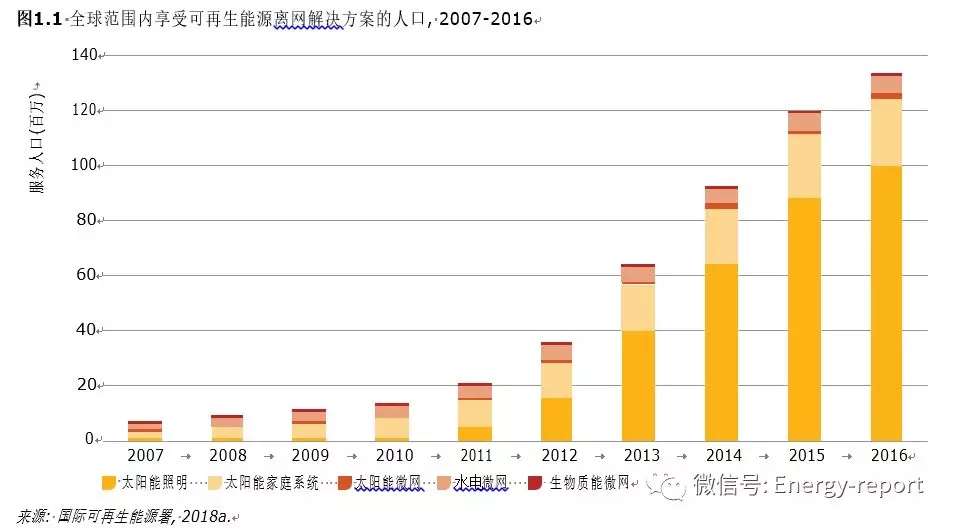 成本大幅降低,技術(shù)進步和相關(guān)支持政策的出臺推動了全球范圍內(nèi)離網(wǎng)可再生能源技術(shù)的應(yīng)用? 據(jù)國際可再生能源署統(tǒng)計,2016年全球約有1.33億人口享受離網(wǎng)技術(shù)提供的服務(wù),至少900萬人口接入到可再生能源微電網(wǎng)中,1.24億人口使用太陽能照明解決方案和太陽能家庭系統(tǒng)?(圖 1.1)