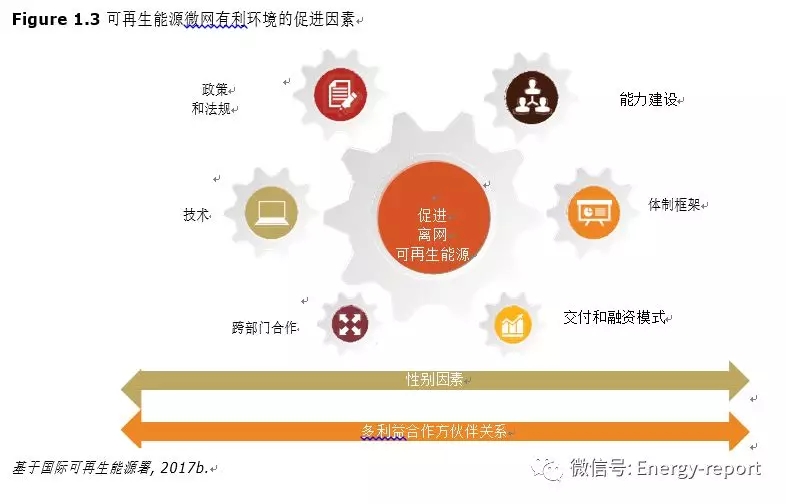 如圖1.3所示,為可再生能源微電網(wǎng)建立有利環(huán)境取決于幾個因素? 其中包括政策和法規(guī)?體制框架?交付模式和融資,技術(shù)解決方案,能力建設(shè)和跨部門合作(國際可再生能源署,2017a)? 其中一些因素相互關(guān)聯(lián)?