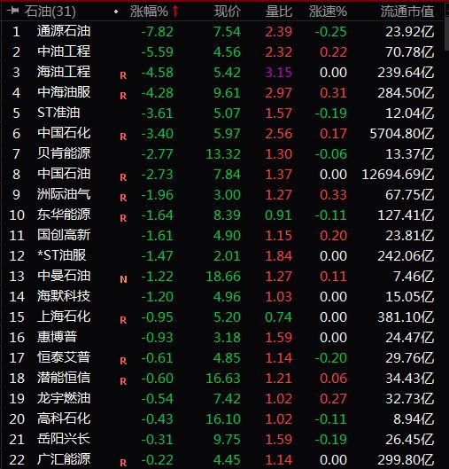 截至收盤,石油板塊位居兩市行業(yè)板塊跌幅首位。個(gè)股方面,通源石油(7.540, -0.64, -7.82%)下跌逾7%,中油工程、海油工程、中海油服跌幅超過(guò)4%,中國(guó)石化跌逾3%,中國(guó)石油跌幅近3%。