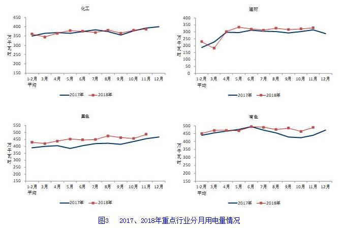 1-11月份,化學原料制品、非金屬礦物制品、黑色金屬冶煉和有色金屬冶煉四大高載能行業用電量合計17450億千瓦時,同比增長6.0%;合計用電量占全社會用電量的比重為28.1%,對全社會用電量增長的貢獻率為20.5%。其中,化工行業用電量4073億千瓦時,同比增長2.6%;建材行業用電量3203億千瓦時,同比增長5.8%;黑色金屬冶煉行業用電量4941億千瓦時,同比增長10.3%;有色金屬冶煉行業5234億千瓦時,同比增長5.1%。