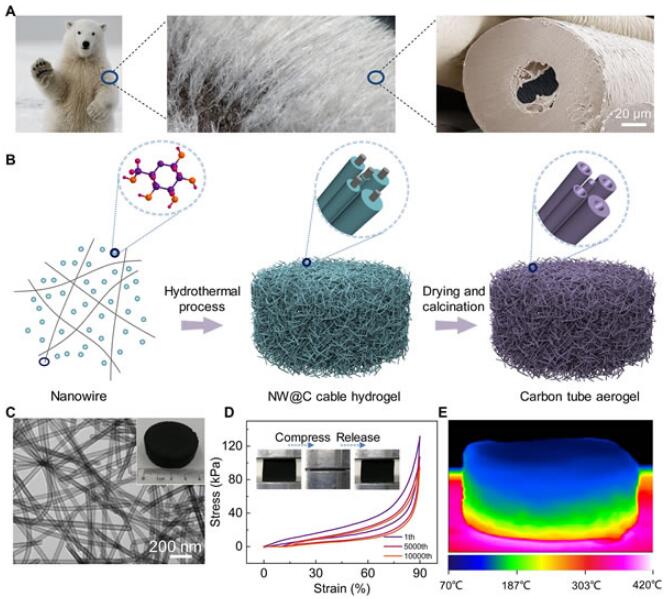 圖1.CTA的制備。(A)北極熊毛的結構;(B)示意圖,表明用一維納米線作為模板制備CTA的方法;(C)CTA的透射圖;(D)CTA在壓縮形變為90%的條件下,壓縮一萬次的應力-應變曲線;(E)CTA在400℃熱臺上的熱紅外圖像,表明良好的隔熱能力。