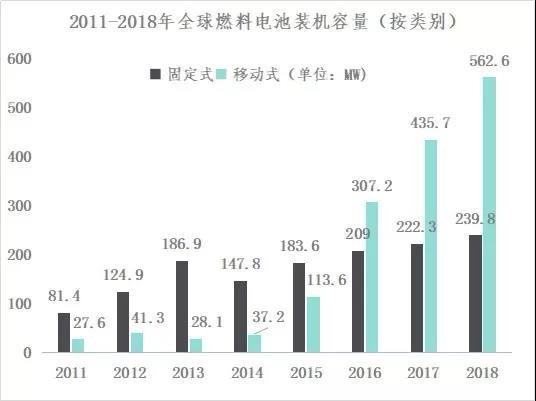 燃料電池是目前氫能源下游主要應(yīng)用場景之一。國際能源署數(shù)據(jù)顯示,2018年全球燃料電池的裝機量約803MW,同比增長22%;其中移動類裝機量562.6MW,同比增長29.17%;固定式裝機量239.8MW,比上年增長7.87%。截至2018年底,全球燃料電池汽車保有量超過15,000輛,其中美國約6500輛,為全球第一;中、日、韓三國保有量分別為3500、2700、2000輛;其中我國燃料電池車基本為商用車,美、日、韓三國以乘用車為主。在其他領(lǐng)域,美國目前還有超過2萬輛燃料電池叉車,累計加氫600萬次。