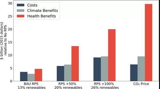 為了達到47億美元的數字,研究人員專注于各州目前的可再生能源組合標準,這些政策要求公用事業公司從可再生能源中產生一定比例的電力。這些州的平均目標現在設定為13%。但如果該地區的州將其可再生能源發電的比例提高到19.5%,那么2030年的健康效益將達到135億美元,而成本將達到58億美元。將其可再生能源使用量增加到其總能源組合的約26%將導致200億美元的健康效益,而實施成本將達到90億美元。該團隊使用了一個結合經濟和空氣污染模型的框架來得出他們的結論。