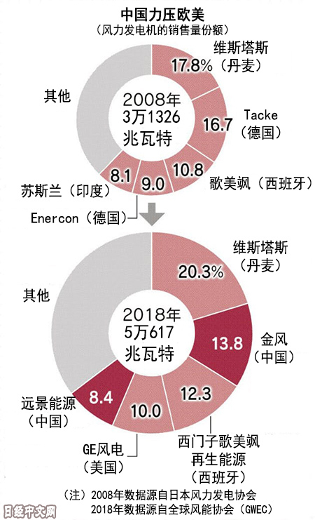 文章稱,在上海一座辦公大樓的一角,全球排名第5的中國風力發電機廠商遠景能源的幾十名操作員監控著1億千瓦的可再生能源設施,這相當于整個日本的規模。