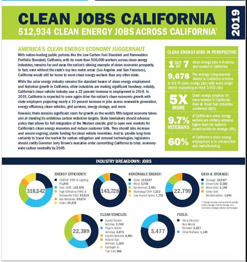 ——在全州范圍內(nèi),2018年清潔能源行業(yè)共有512,934個就業(yè)崗位。其中包括可再生能源就業(yè),如安裝太陽能和風(fēng)能;建設(shè)電動和混合動力汽車;在建筑物中進行能源效率工作;制造清潔燃料和建設(shè)電池存儲項目。