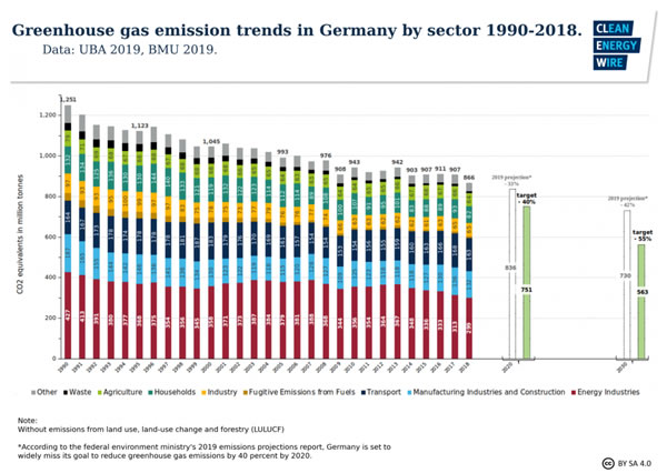 德國的2030年氣候目標規定,與1990年相比,溫室氣體排放水平應降低55%,這意味著碳排放量必須從2018年的約8.66億噸減少到下一個十年末的5.63億噸。而2020年相比1990年減排40%的目標實際已經確認不可能實現,德國環保部在其最新的排放預測報告中預計2020年將減排約32%。