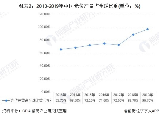 我國是光伏產業大國,擁有全球最完整的產業鏈。2019年,同期,盡管在政策調整下,我國光伏應用市場有所下滑,但受益于海外市場的增長,中國光伏各環節產業規模依舊保持了快速增長勢頭。2019年,中國光伏組件產量達到了98.6GW,占全球產量比重不斷上升。作為全球最大光伏產品制造國及出口國,中國光伏裝機量、發電量已連續多年位列全球首位。