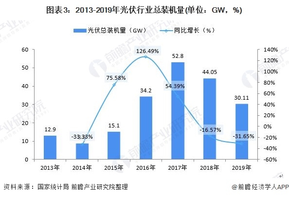 2013-2019年,光伏行業總裝機量呈現出波動變化的趨勢。2013-2017年,呈現出波動上升的趨勢,2017年,我國光伏行業裝機總量為52.8GW,為歷年最高值,2018-2019年,受政策影響,光伏行業裝機量驟減,2019年光伏行業裝機總量為30.11GW,較上年下降31.65%。