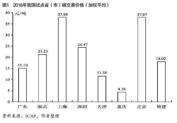2011年10月,國家發展改革委確定在北京、天津、上海、重慶、廣東(廣州)、湖北、深圳開展碳排放權交易試點,2013年6月,深圳率先啟動碳交易;2016 年9月,福建省為貫徹落實《國家生態文明試驗區(福建)實施方案》,加入碳交易試點。目前,8 個試點地區覆蓋了電力、鋼鐵、水泥、建筑、交通運輸、石油化工等行業超過3200家重點排放企業,整體履約良好,低碳意識不斷提高,實現了碳排放總量和強度“ 雙下降” 。2 0 1 8 年我國試點省市碳排放權交易平均價格為21.3元/噸;截至2018年底,我國碳市場累計成交量接近8億噸,累計成交額超過110億元(我國試點省市碳交易價格見圖1,試點碳市場運行情況見表1)。