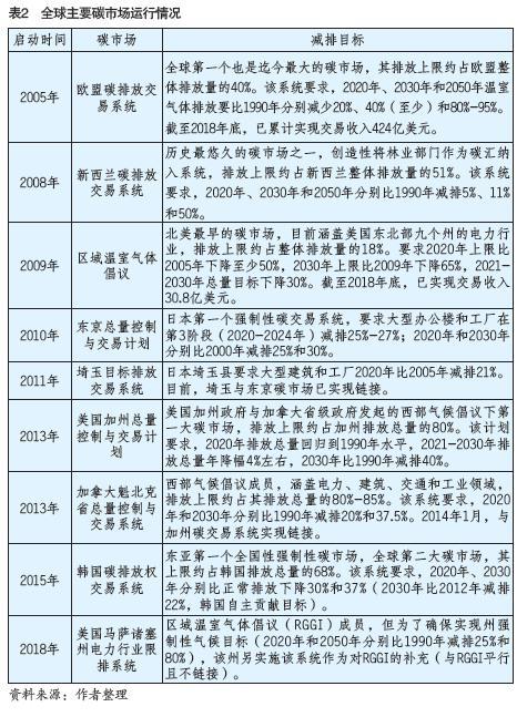 當前,全球正面臨持續嚴峻的氣候問題挑戰,各國2030年自主貢獻目標與實現巴黎氣候協定目標仍存在巨大缺口。為碳排放權定價、構建碳交易市場,已成為國際社會促進低碳發展和技術創新的關鍵政策工具。除目前已運行的碳市場外,還有許多國家或地區正在籌建或考慮建立碳交易系統(包含中國、俄羅斯、日本、墨西哥、巴西等國家系統以及美國各州等區域系統)。隨著越來越多的國家或地區考慮將碳市場作為節能減排的政策工具, 碳交易已逐漸成為全球應對氣候變化政策的核心支柱(全球目前主要碳市場運行情況見表2)。