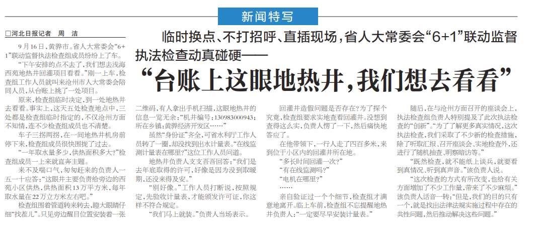 2020年10月30日(今天)出版的《河北日報》以《臺賬上這眼地?zé)峋覀兿肴タ纯础窞轭}報道了河北省人大常委會“6+1”聯(lián)動監(jiān)督執(zhí)法檢查組成員采用“臨時換點、不打招呼”明察暗訪的檢查方式對河北滄州黃驊市淺海西苑小區(qū)地?zé)峋毓囗椖窟M行了執(zhí)法檢查。