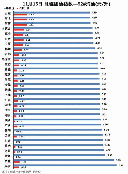 據11月15日能鏈團油指數顯示,在92#汽油方面,山東零售價最低,為4.59元/升,海南最高,達6.20元/升。優惠力度方面,山東和甘肅分別以0.82元/升和0.01元/升的“讓利”幅度,分列優惠力度最大和優惠力度最小的地區。