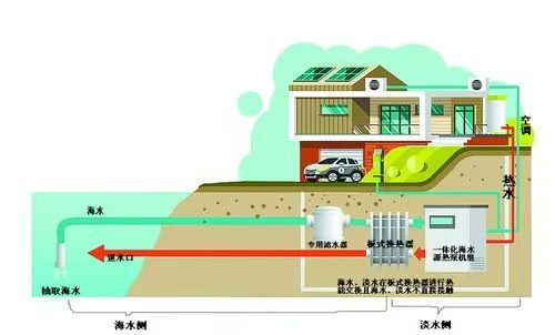 海水儲藏太陽能資源,且水體溫度相對固定,冬季海水溫度高于環境溫度,夏季則低于環境溫度。海水源熱泵系統的工作原理,就是在消耗少量電能的情況下,在冬季把海水中的能量“取”出來,給建筑物供熱;夏季則把建筑物內的能量“取”出來釋放到海水中,達到調節室內溫度的目的。海水源熱泵機就像一座冷熱交換站,海水、淡水通過“板式換熱器”完成冷熱交換,進而為建筑制冷、供熱。