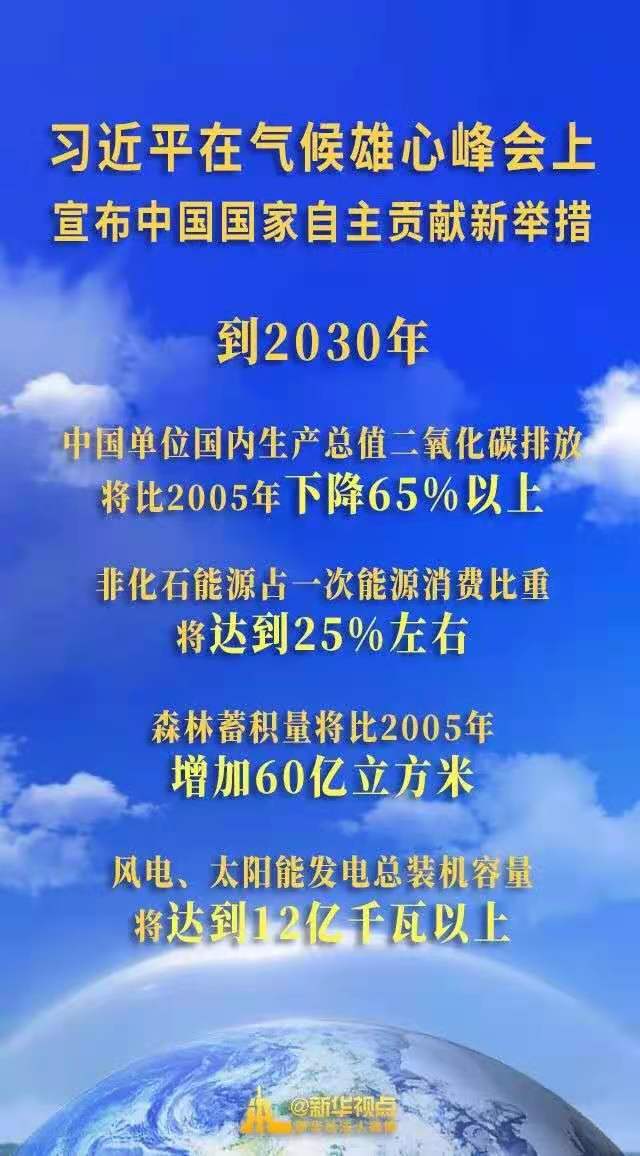12月12日,在氣候雄心峰會上,國家主席習近平通過視頻發(fā)表題為《繼往開來,開啟全球應(yīng)對氣候變化新征程》的重要講話,宣布中國國家自主貢獻一系列新舉措。