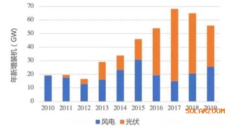 先從數(shù)據(jù)的層面看,數(shù)據(jù)顯示,近年來我國風電、太陽能發(fā)電裝機始終保持迅猛增長態(tài)勢。2014—2019年,全國風電和太陽能發(fā)電合計新增規(guī)模分別為33GW、48GW、54GW、68GW、65GW、56GW,2020年1—10月新增約46GW。