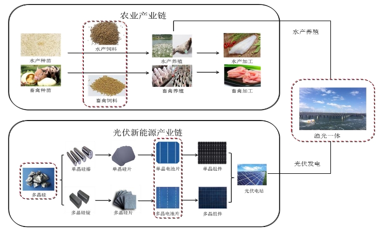 通威股份以農(nóng)業(yè)及太陽(yáng)能光伏為主業(yè),形成“農(nóng)業(yè)(漁業(yè))+光伏”資源整合、協(xié)同發(fā)展的經(jīng)營(yíng)模式,主要業(yè)務(wù)及在產(chǎn)業(yè)鏈中的位置如下圖所示: