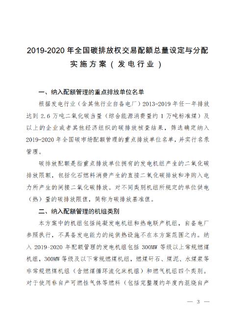 關于印發(fā)《2019-2020年全國碳排放權交易配額總量設定與分配實施方案(發(fā)電行業(yè))》《納入2019-2020年全國碳排放權交易配額管理的重點排放單位名單》并做好發(fā)電行業(yè)配額預分配工作的通知
