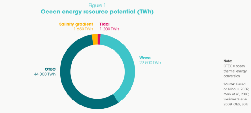 根據國際可再生能源署(IRENA)的數據,所有海洋能源技術的發電潛力總和為45,000-130,000太瓦時(TWh),這意味著海洋能源可以滿足目前全球電力需求的兩倍以上。