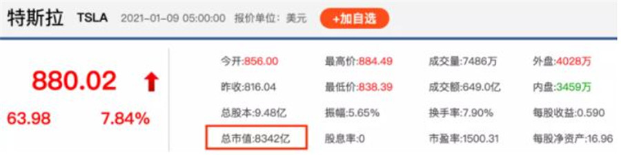 2021年1月8日,特斯拉股價再創新高達到880美元/股,市值創紀錄地達到了近8342億美元,這個市值已經超過了當前排名前十的傳統汽車制造企業。
