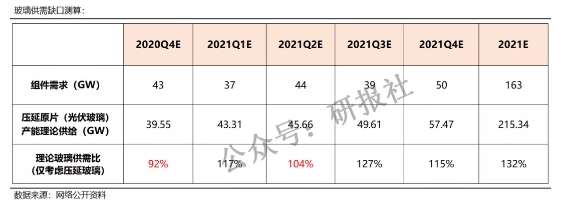 根據(jù)目前各廠商披露的2021年擴(kuò)產(chǎn)計(jì)劃,假設(shè)2021年新投產(chǎn)窯爐全部可以生產(chǎn)182/210組件所需的寬版玻璃,并考慮浮法玻璃替代部分背板玻璃的情況,理論能夠支撐182及210組件產(chǎn)量最高為56.26GW,而目前大組件總共產(chǎn)能規(guī)劃95GW,大組件需要的寬版玻璃缺口為48.74GW。