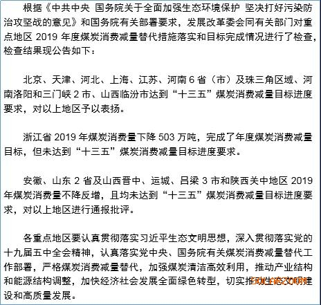 根據2021年2月8日國家發改委、工信部、財政部、生態環境部、統計局、能源局聯合發布的2021年第2號《關于重點地區2019年度煤炭消費減量替代工作檢查結果的公告》: