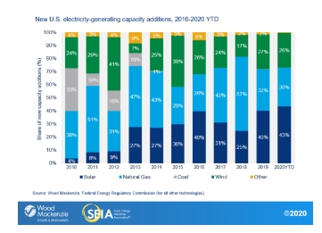 預(yù)計(jì)美國2020年新增發(fā)電中太陽能(深藍(lán)色)占比將達(dá)到43%。圖片來源:SEIA