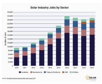 然而,事實(shí)勝于雄辯。截至到2019年,美國光伏行業(yè)的從業(yè)人數(shù)約為25萬人,比2016年少了整整一萬人,其中16.2萬人負(fù)責(zé)下游組件的的安裝,上游生產(chǎn)端的人數(shù)只有3.4萬人,比2016年少了3700人。