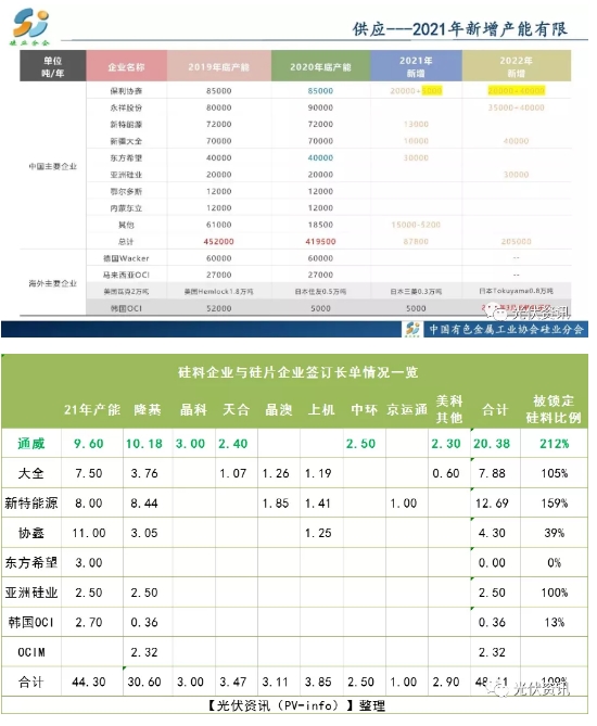 根據公開資料顯示,截至2020年底,大全新能源硅料產能達7萬噸,2021大全7.5萬噸硅料產能產能已被隆基、天合、晶澳、上機數控等鎖定;新特2020年底硅料產能達7.2萬噸,2021年隆基、晶澳、上機數控共鎖定新特11.69萬噸硅料產能,遠超其實際產能8萬噸;東方希望硅料產能2021年預計產能3萬噸;亞洲硅業2021年的2.5萬噸硅料產能將全部供應給隆基;2021年協鑫4.51萬噸硅料產能已被上機數控、隆基股份、中環股份三家聯合鎖定,實際產能11萬噸。