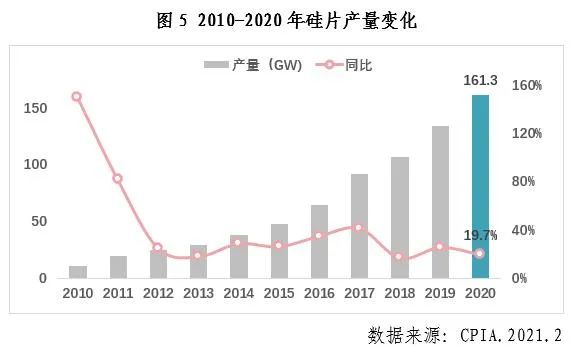 盡管受到年初的疫情沖擊、7-8月多晶硅料企業(yè)安全事故及新疆地區(qū)疫情導致的硅料供應緊張、以及7月開始由于光伏玻璃、EVA膠膜等供應緊張導致的原輔材料價格上漲等黑天鵝事件,我國光伏產(chǎn)業(yè)在國內(nèi)外市場的推動下,規(guī)模持續(xù)擴大。其中,多晶硅產(chǎn)量39.2萬噸,同比增長14.6%;硅片產(chǎn)量161.3GW,同比增長19.7%;電池片產(chǎn)量134.8GW,同比增長22.2%;組件產(chǎn)量124.6GW,同比增長26.4%。